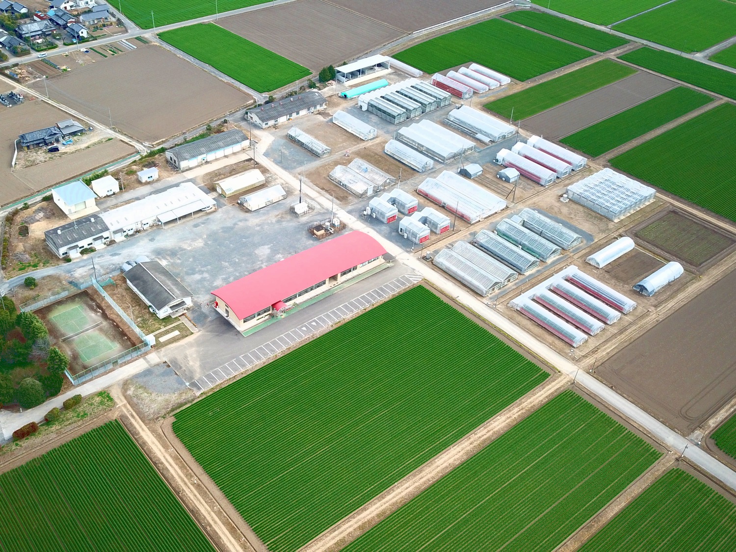 - 正門から入ると、広々とした圃場が広がり、来場者に開放的な印象を与えます。正面奥には本館が。その他、広大な敷地にはいちごハウス、畑が広がり、自然を満喫できます。特に、春には麦秋を迎えます。