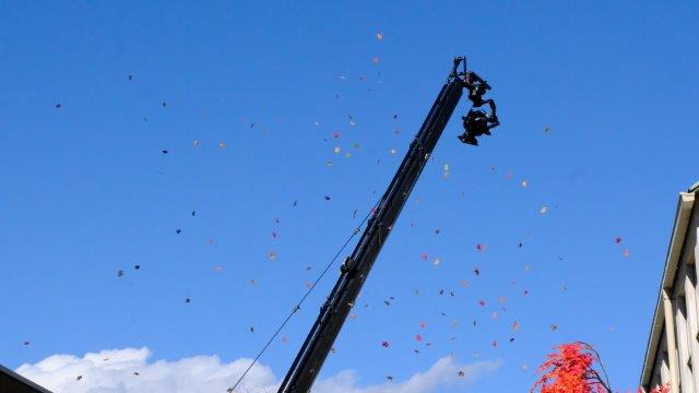 秋の美しい情景を演出するため、たくさんの紅葉を舞わせました